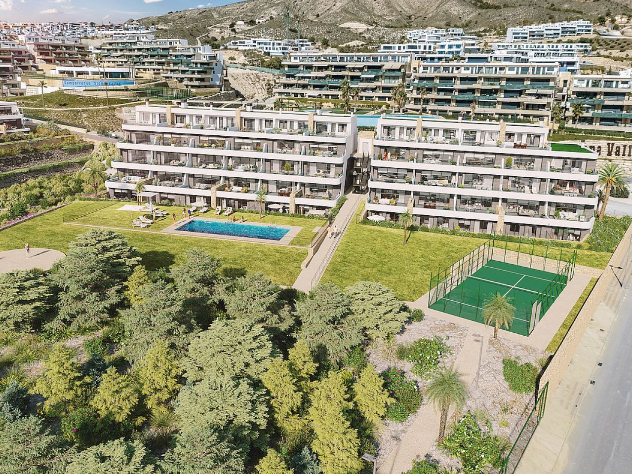 Dit is een complex met grote gemeenschappelijke ruimtes, met overloopzwembad en overdekt verwarmd zwembad, Finse sauna, een kinderspeelplaats, paddlebanen, fitnessruimte, co-working en sociale ontmoetingsruimte, een groot voetgangers- en fietspad dat door alle gemeenschappelijke ruimtes loopt en grote massa’s vegetatie.