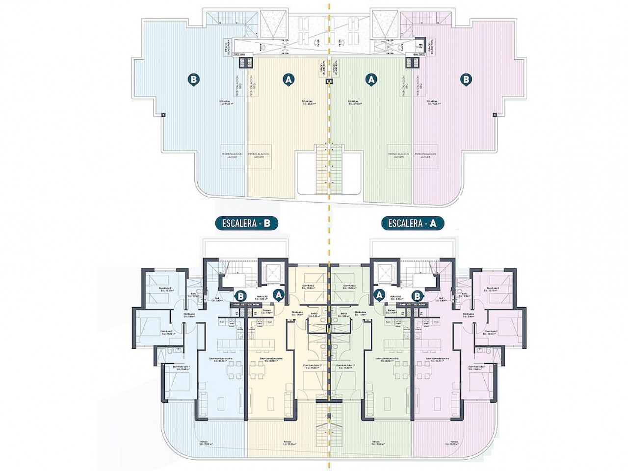 De appartementenblokken bieden woningen met 2 of 3 slaapkamers, beschikbaar op de begane grond en tussenverdiepingen met grote terrassen of als penthouses met privésolaria.