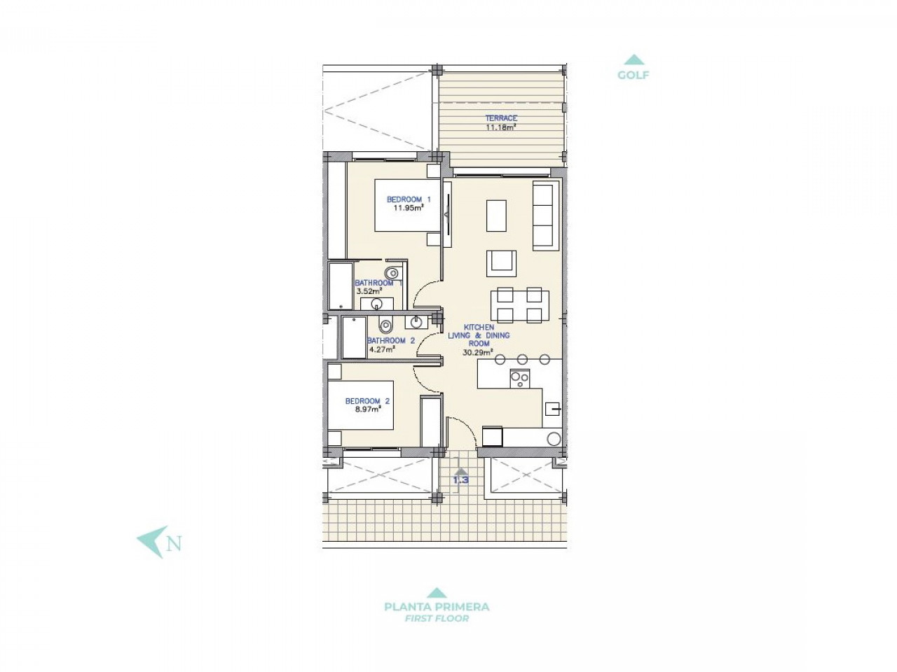 Serena View 2 ligt op de prestigieuze golfbaan ´La Serena Golf´. Deze golfbaan staat bekend om zijn meren en planten die verweven zijn met de golfbaan. Het water en de meren zijn aanwezig in 16 van de 18 holes, maar de hele baan is ontworpen om de golfer verschillende strategieën te bieden in elke hole. Een ander aspect dat deze golfbaan uniek maakt is dat het te voet verbonden is met het stadscentrum, iets wat onmogelijk te vinden is in andere golflocaties die ons in staat stellen om te genieten van de rust en de schoonheid van het gebied zonder de toegang te weigeren tot de diensten die Los Alcázares biedt. Los Alcázares is een uitzonderlijk gebied aan de Costa Cálida op slechts 25 minuten van de luchthaven van Murcia en 55 minuten van de luchthaven van Alicante. Het gebied is via de snelweg verbonden met de steden Cartagena, Murcia en Alicante en de rest van de stranden van de Costa Cálida en de Costa Blanca.