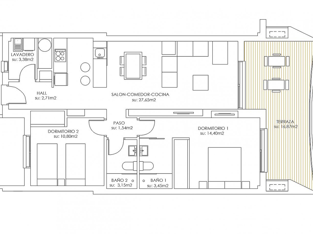 Het resort zal beschikken over prachtig ingerichte, moderne appartementen met grote terrassen, hier kunt u kiezen tussen twee slaapkamers of drie slaapkamers en twee badkamers. Alle penthouses hebben een groot privé solarium.
