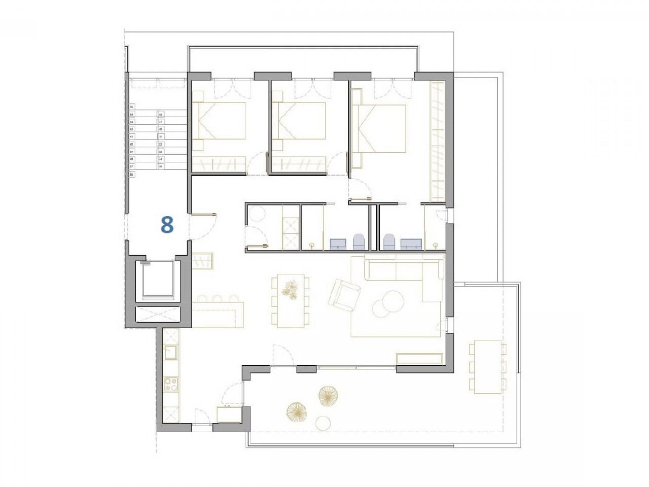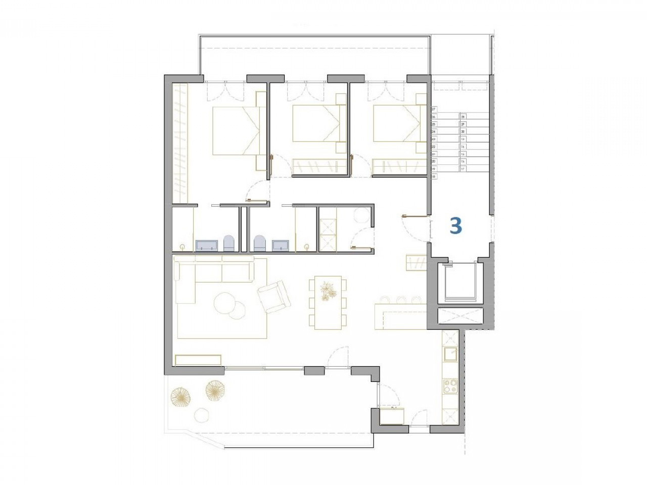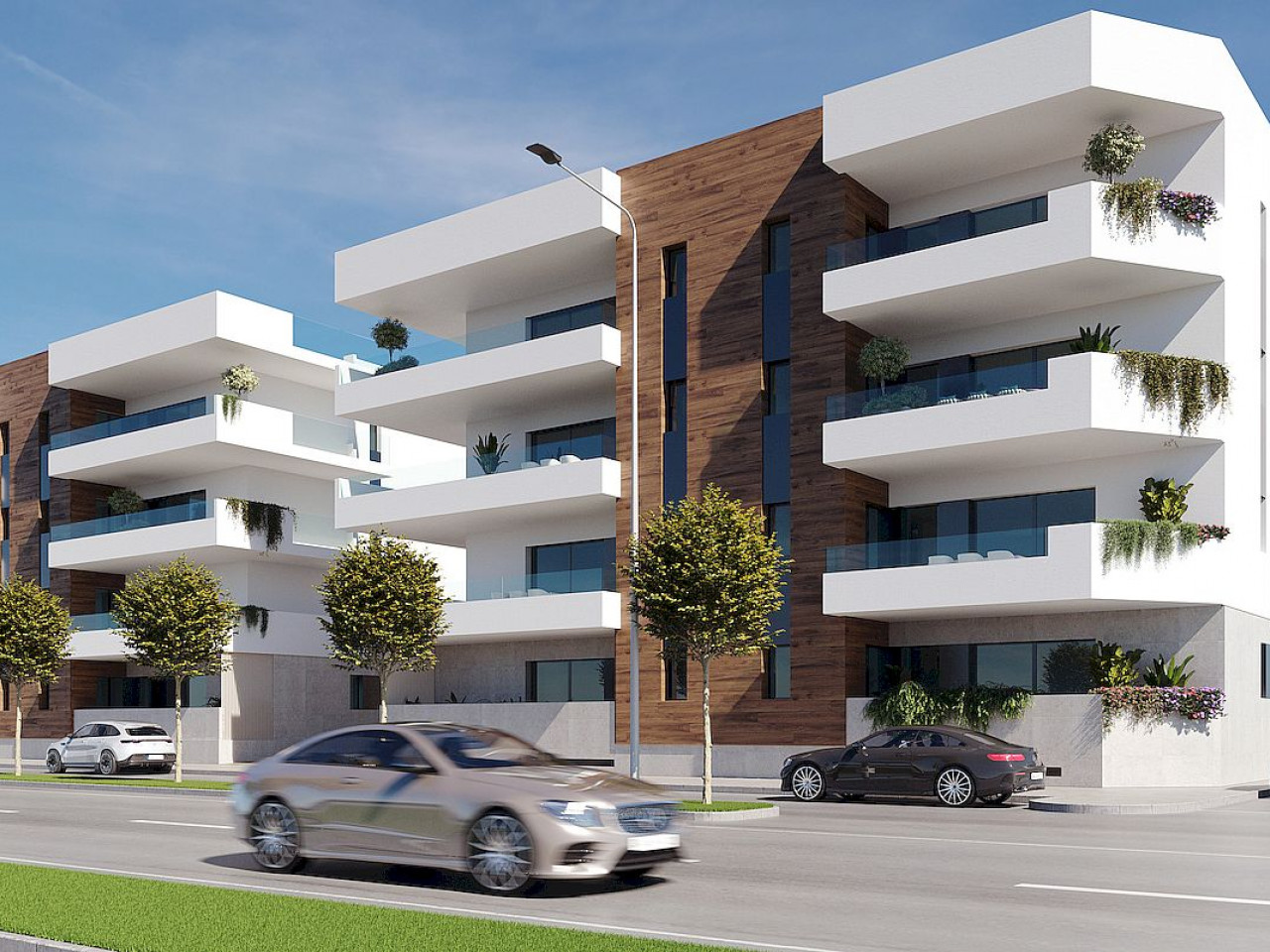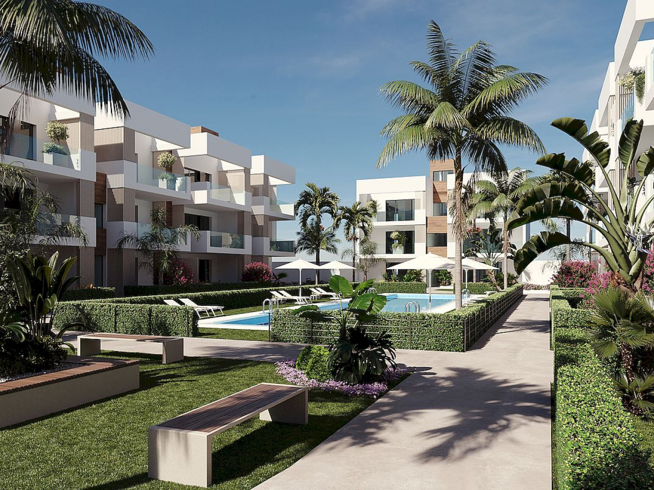 Appartementen en penthouses met 2 en 3 slaapkamers, 2 badkamers, met open keuken met woonkamer, grote terrassen, inbouwkasten, volledig uitgeruste badkamers, terrassen. Appartementen op de begane grond hebben een privétuin en penthouses op de bovenste verdieping hebben een privésolarium. Elke woning heeft een ondergrondse parkeergarage met berging.