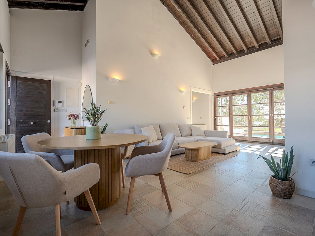 Bestaande uit twee slaapkamers, twee badkamers, een keuken met wasruimte en een uitgebreide eetkamer/salon met twee enorme openslaande deuren die de woning een buitengewone lichtinval geven, onder het indrukwekkende houten balkenplafond.