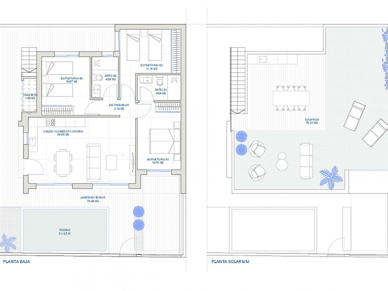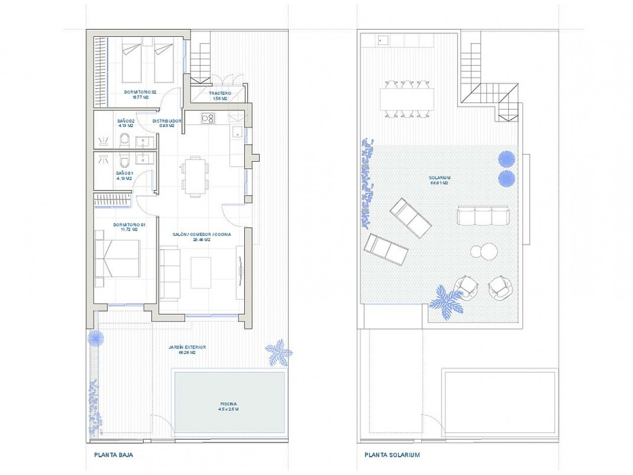 Deze villa’s met 2 of 3 slaapkamers en 2 badkamers, tuin, parkeerplaats, solarium en privézwembad hebben perceelafmetingen tussen 140 m2 en 159 m2. De villa’s hebben afmetingen tussen 74,72 m2 en 85 m2 en de zwembaden hebben een geschatte afmeting van 4,5 m x 2,5 m.