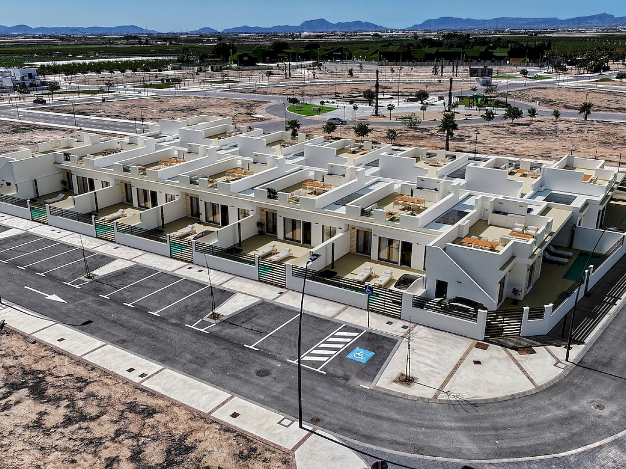 Halfvrijstaande woning met veel mogelijkheden Nieuwe exclusieve ontwikkeling van moderne gelijkvloerse geschakelde en geschakelde villa’s met solarium en privézwembad gelegen in het exclusieve El Alba complex in Roldán (Murcia). De Chalets met 2 of 3 slaapkamers en 2 badkamers hebben een open ontwerp met de hoofdslaapkamer en-suite, ook veel buitenruimte met grote tuin met ruim privézwembad, solarium met zomerkeuken en parkeerplaats op het perceel. Alle woningen hebben een volledig ingerichte keuken inclusief witgoed en pre-installatie voor airconditioning en hebben ook het voordeel dat ze in het omheinde El Alba Mediterranean Resort liggen. Gelegen in een omheind complex met veiligheidscontrole, garandeert dit project privacy en rust, terwijl het toch dicht bij alle essentiële voorzieningen, parken, sportfaciliteiten en prestigieuze golfbanen ligt. Dit project ligt op slechts enkele minuten van enkele van de beste golfbanen in de omgeving, zoals La Torre Golf en Terrazas Golf, en biedt een unieke ervaring voor golfliefhebbers. Roldán is een charmant traditioneel dorp met een bevoorrechte ligging in de regio Murcia. Het heeft alle essentiële voorzieningen zoals supermarkten, restaurants, bars, gezondheidsklinieken, apotheken, benzinestations en meer. De luchthaven Murcia-Corvera ligt op 15 km afstand (15 minuten met de auto).