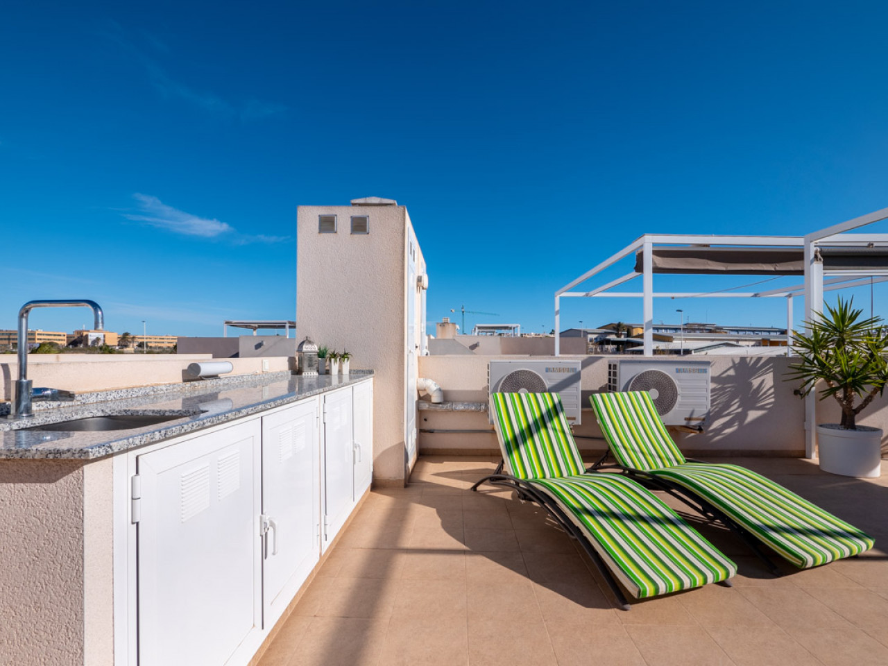 Het dakterras van het huis is een waar juweeltje. Hier vind je een buitendouche en een functionele buitenkeuken, waardoor het ideaal is om zomeravonden door te brengen met koken en