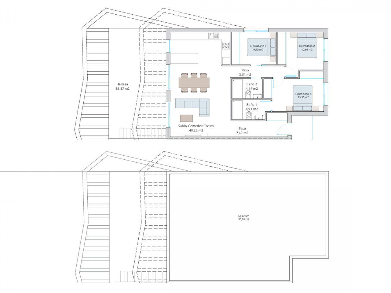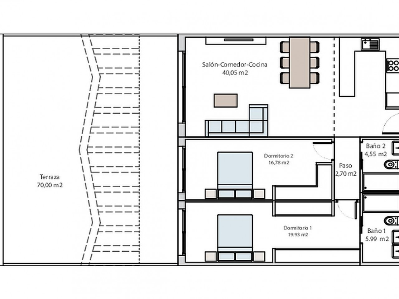 Deze moderne woningen hebben 2 of 3 slaapkamers, 2 badkamers en ruime woonkamers vol natuurlijk licht. Er is keuze tussen een maisonnette op de begane grond met een grote tuin (en de optie om een privézwembad toe te voegen) en een penthouse met ruim dakterras. Ze hebben allemaal een grote woonkamer met moderne open keuken en schuiframen die toegang geven tot het terras aan de voorkant.