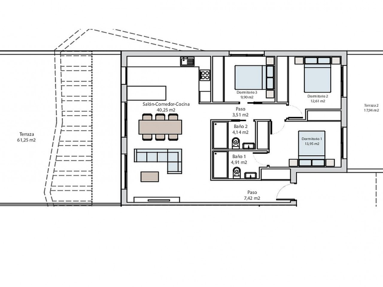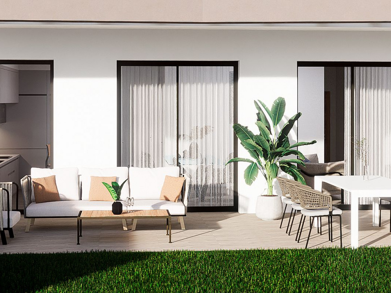 Deze moderne woningen hebben 2 of 3 slaapkamers, 2 badkamers en ruime woonkamers vol natuurlijk licht. Er is keuze tussen een maisonnette op de begane grond met een grote tuin (en de optie om een privézwembad toe te voegen) en een penthouse met ruim dakterras. Ze hebben allemaal een grote woonkamer met moderne open keuken en schuiframen die toegang geven tot het terras aan de voorkant.