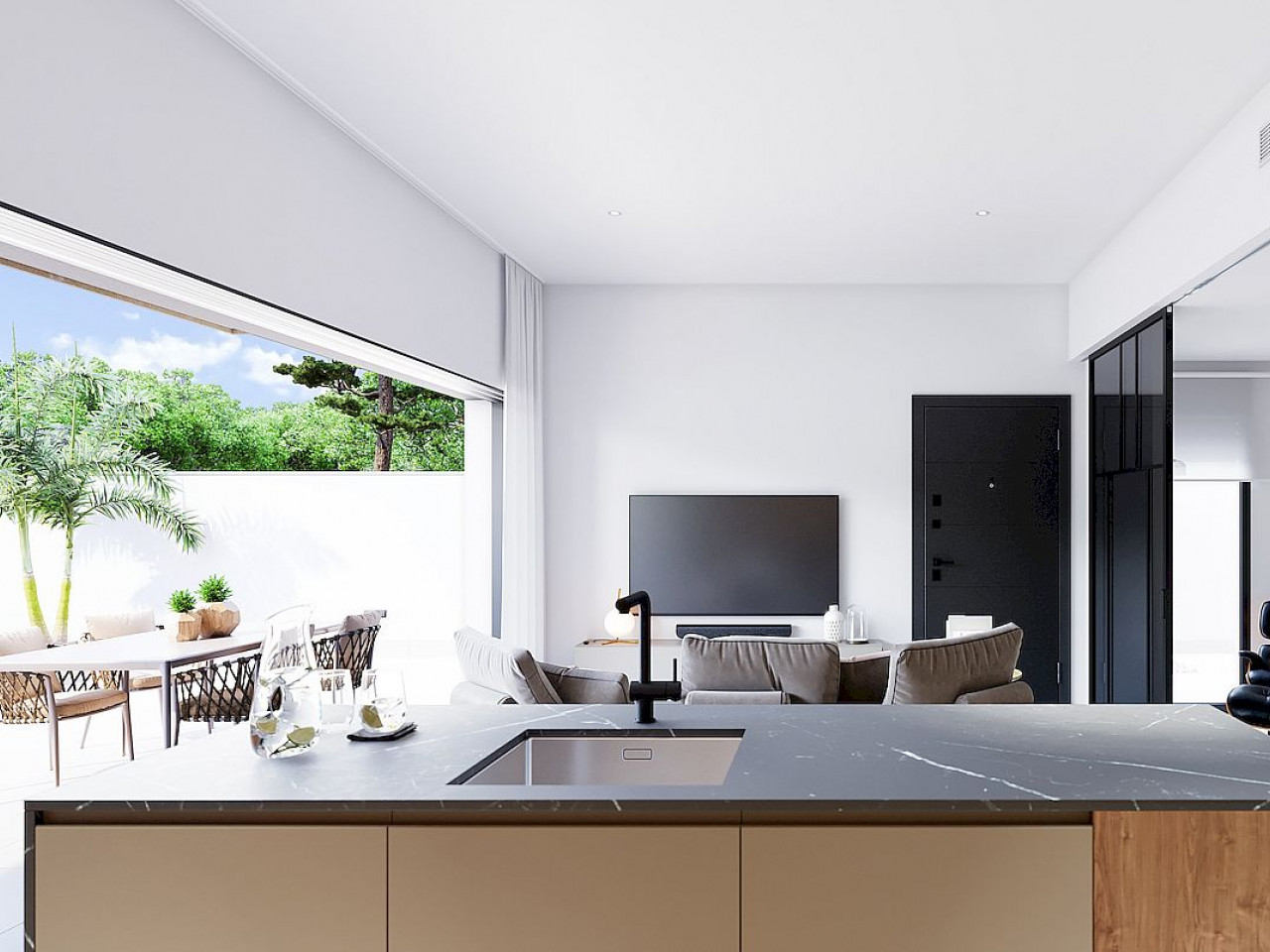 Dit nieuwe project biedt een verscheidenheid aan indelingen met 2 en 3 slaapkamers, geschikt voor verschillende behoeften en levensstijlen. De maisonnettes op de begane grond hebben grote terrassen op het oosten/westen met privézwembaden met strandgedeelte en volledig aangelegde tuinen. Ze hebben twee of drie slaapkamers, twee badkamers, een wasruimte en een ruime indeling. De maisonnettes op de tweede verdieping zijn hetzelfde van binnen, maar hebben enorme solariums van waaruit u kunt genieten van het privézwembad, de volledig uitgeruste buitenkeuken, een pergola met doek en een afgesloten toilet op het dak, plus een speciale fietsenstalling op de begane grond.