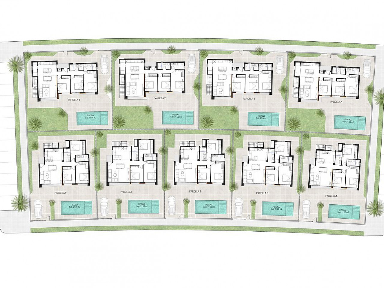 Residencial Oriol bestaat uit luxe villa’s in moderne stijl met 3 slaapkamers en 2 badkamers, verdeeld over één verdieping, op grote kavels in Condado de Alhama Golf, naast het winkelcentrum Al-Kassar.
