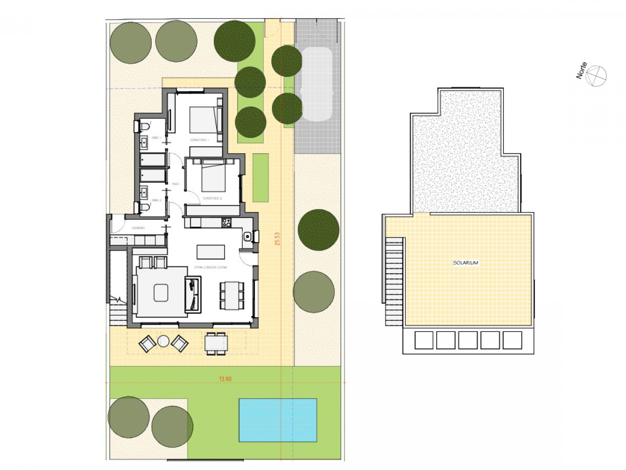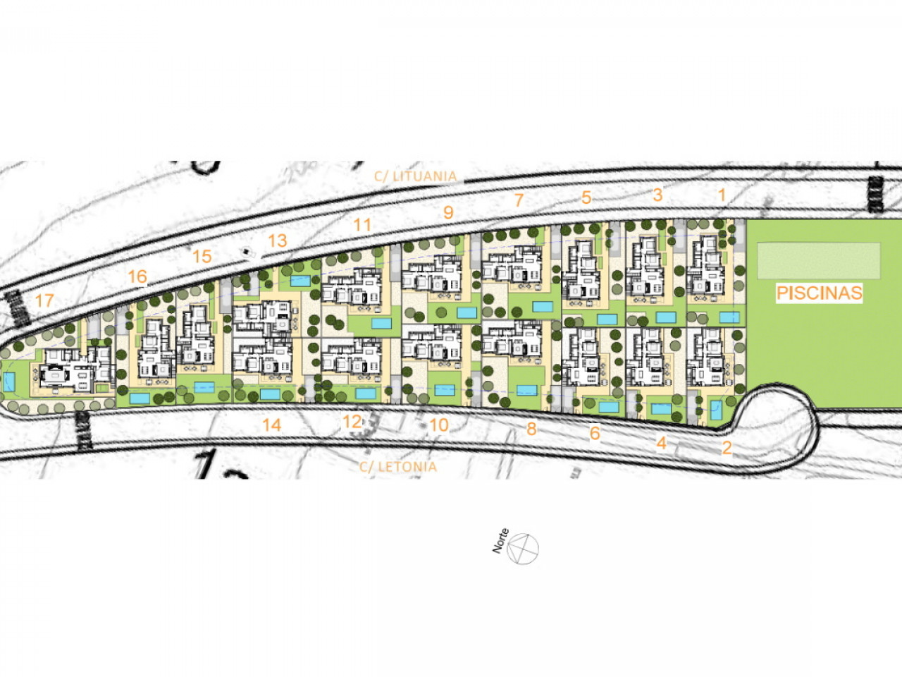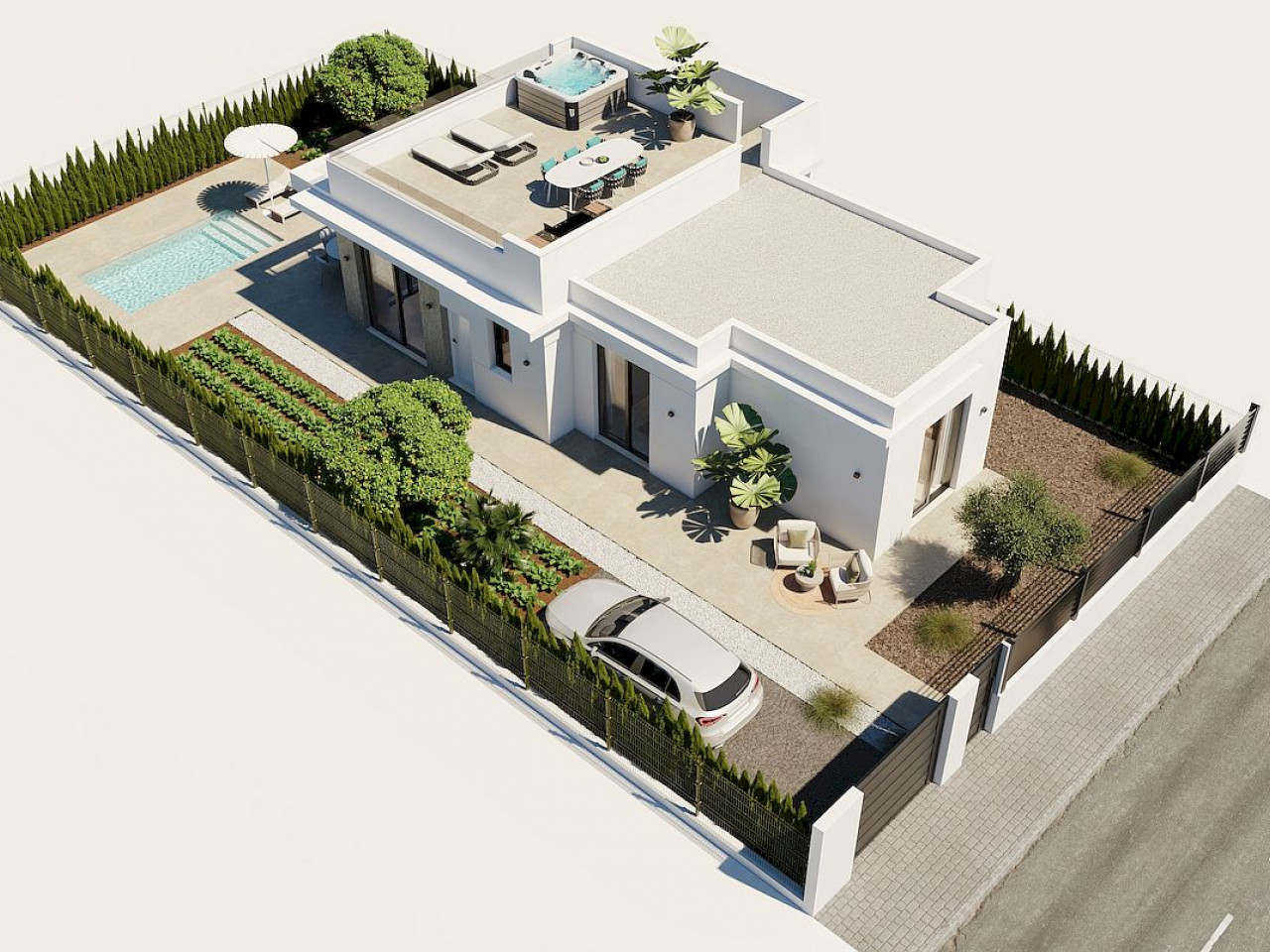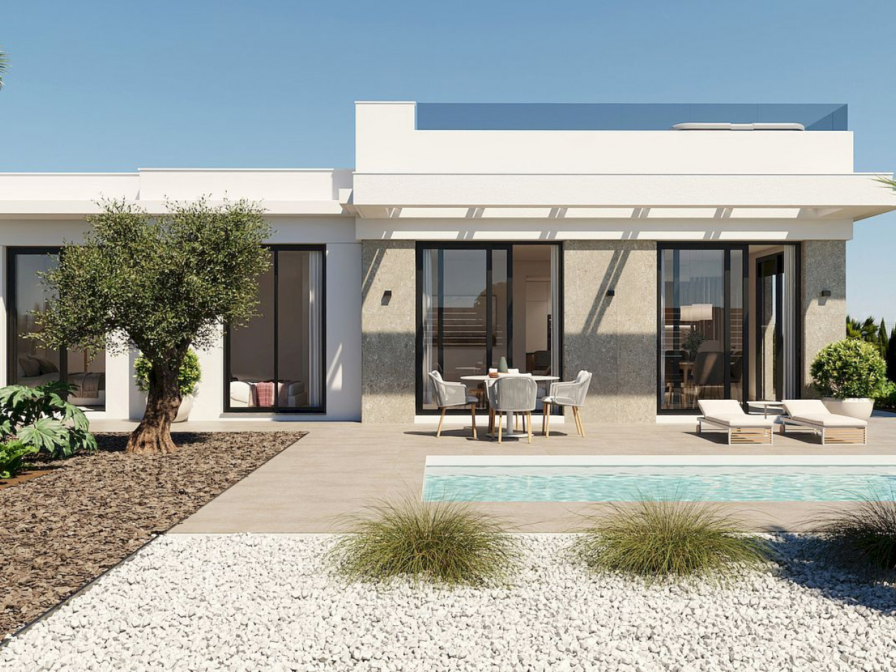 Het wooncomplex bestaat uit 17 gelijkvloerse villa’s op percelen vanaf 300 m². Alle woningen hebben 2 of 3 slaapkamers en 2 complete badkamers op één verdieping, evenals een terras met een privézwembad en een privébalkon op het dak met vrij uitzicht op de bergen en de hele dag zon.