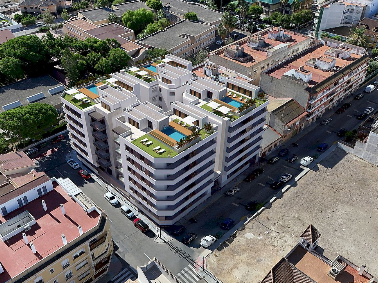 Centraal gelegen in een typisch Spaans dorp Almoradi Nieuwbouw wooncomplex met appartementen en penthouses in het centrum van Almoradi. Moderne woningen met 3 slaapkamers en 2 badkamers, een ruime woonkamer met open keuken en schuiframen die toegang geven tot het terras. Elk appartement heeft een eigen ondergrondse parkeerplaats en een afgesloten berging. In de gemeenschappelijke ruimte kun je het hele jaar door genieten van de zon en het grote zwembad. Residentieel gelegen op 20 minuten van de prachtige stranden van Guardamar Del Segura. Restaurants, bars, supermarkten, sportscholen zijn op loopafstand. Almoradi ligt dicht bij de dorpen Formentera Del Segura, Cuidad Quesada, Benijofar, Rojales en Algorfa. Er zijn verschillende golfbanen in de buurt, evenals de waterparken van Rojales en Torrevieja. Almoradi is een populaire plek om te wonen vanwege de goede ligging, gecombineerd met de gezelligheid van een Spaans dorp. Het vliegveld van Alicante ligt op 30 minuten rijden.