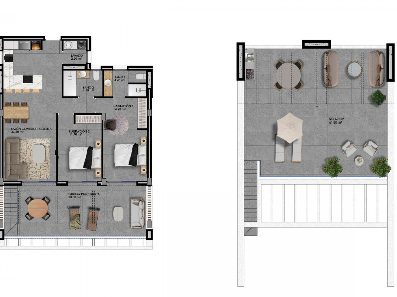 De woningen op de begane grond hebben royale privétuinen van 50 m² tot 273 m². Deze groene zones bieden directe toegang tot het zwembad en de gemeenschappelijke ruimtes, waardoor een perfecte ruimte ontstaat om te ontspannen en optimaal van de omgeving te genieten.