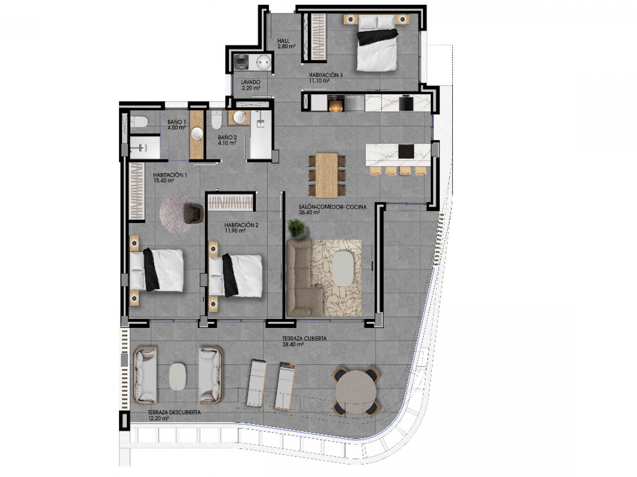 De appartementen hebben 2 of 3 slaapkamers en 2 badkamers, allemaal met ruime terrassen om te genieten van de frisse lucht, het uitzicht en het mediterrane klimaat.