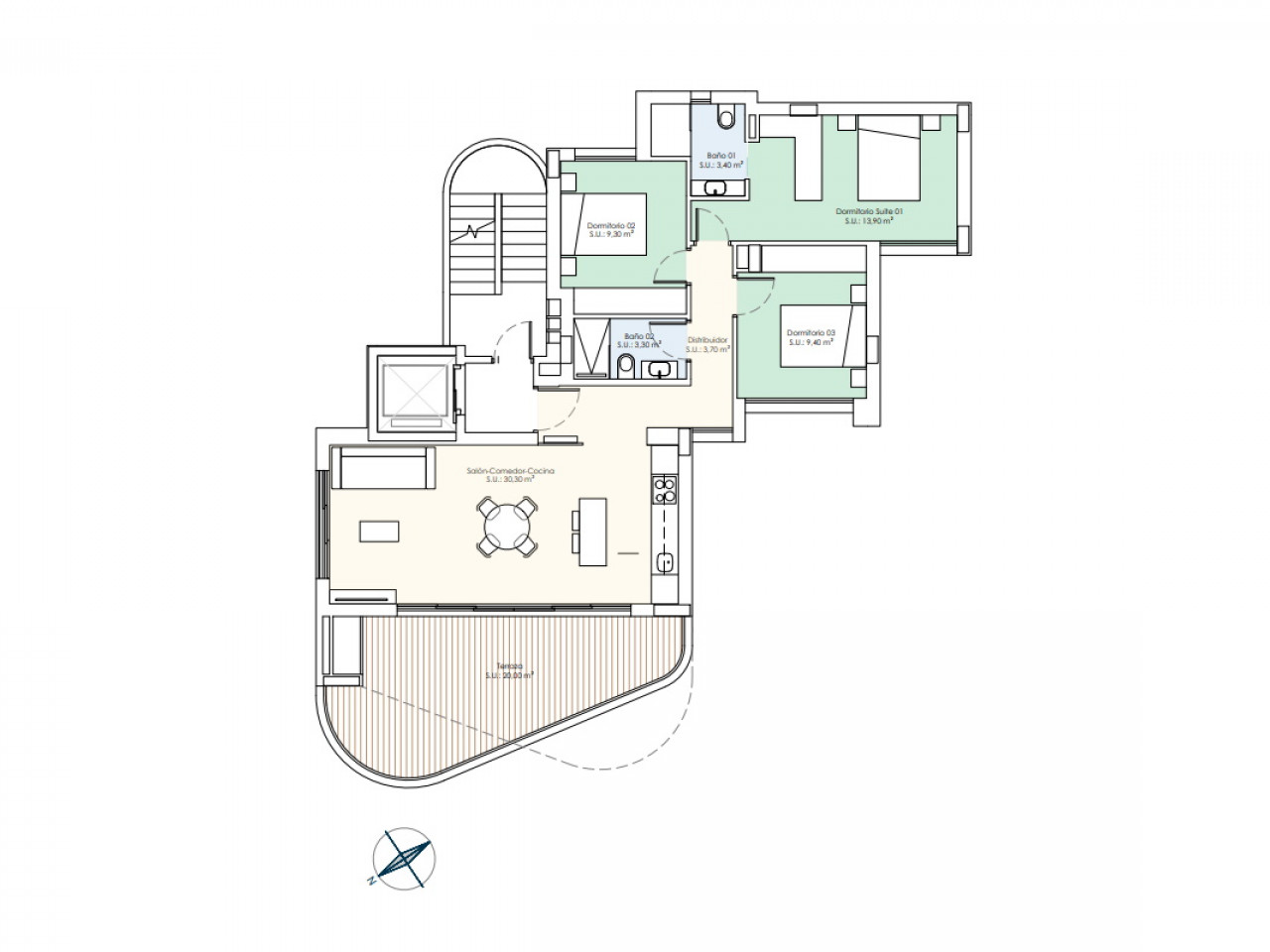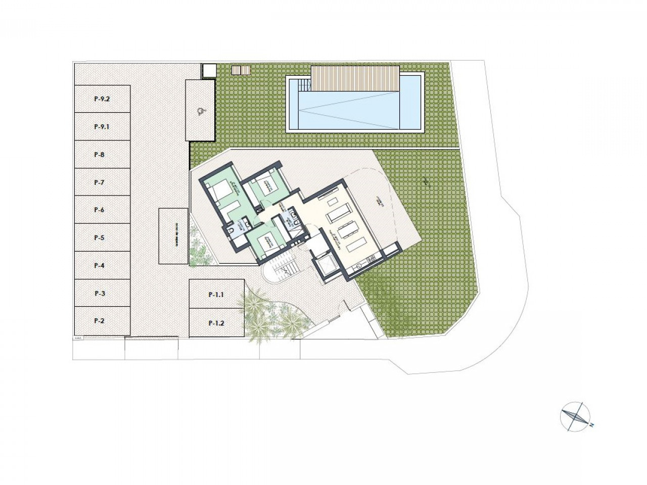 Het gebouw bestaat uit slechts 9 exclusieve woningen, één per verdieping, waardoor privacy, rust en comfort gegarandeerd zijn. Elk appartement heeft 3 slaapkamers en 2 badkamers, evenals ruime buitenruimtes, appartement op de begane grond met 120 m² privétuin, middelste verdiepingen met ruime terrassen en penthouse met terras en 78 m² privésolarium.