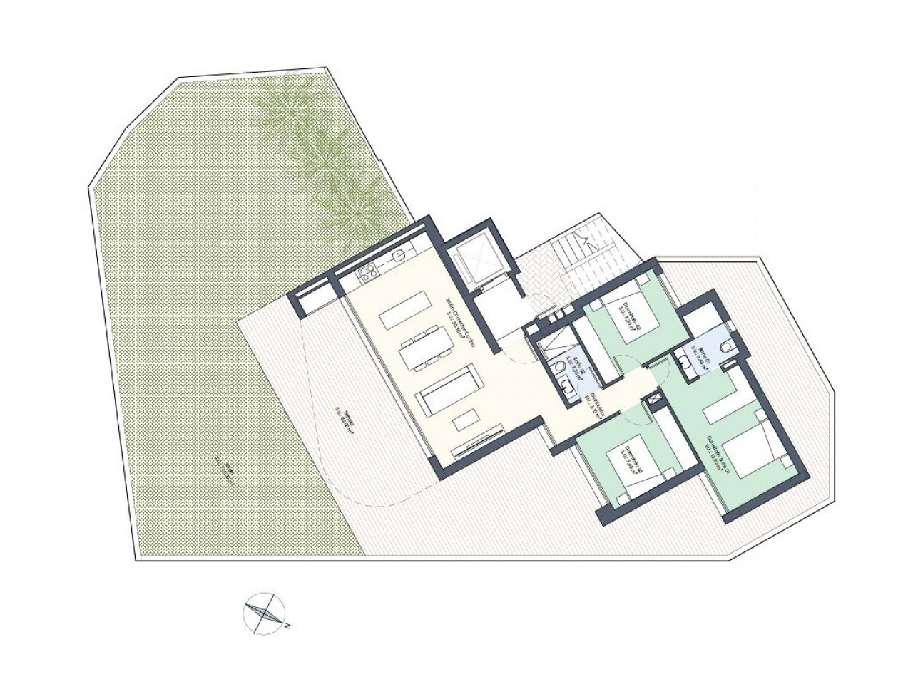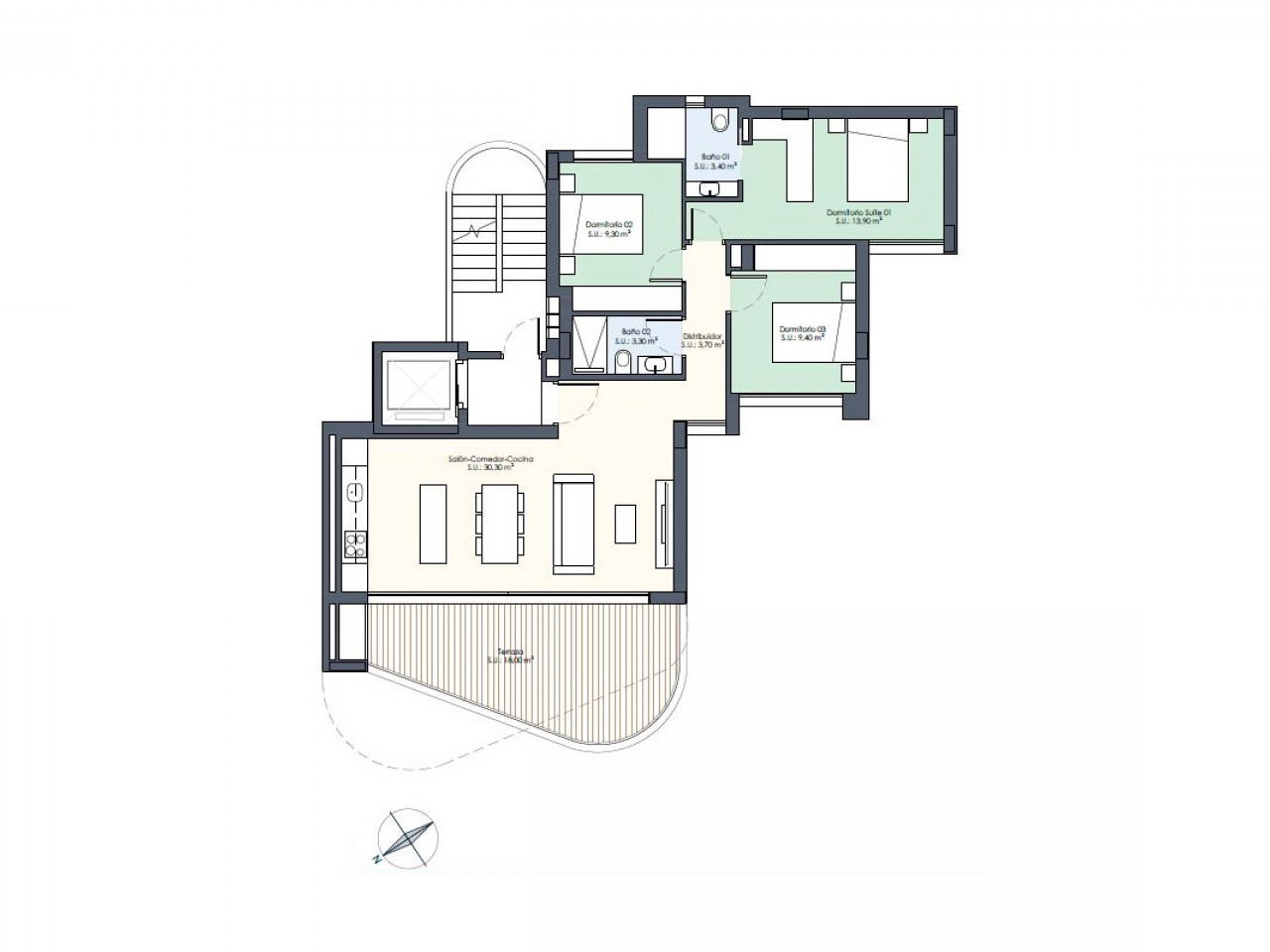 Het gebouw bestaat uit slechts 9 exclusieve woningen, één per verdieping, waardoor privacy, rust en comfort gegarandeerd zijn. Elk appartement heeft 3 slaapkamers en 2 badkamers, evenals ruime buitenruimtes, appartement op de begane grond met 120 m² privétuin, middelste verdiepingen met ruime terrassen en penthouse met terras en 78 m² privésolarium.