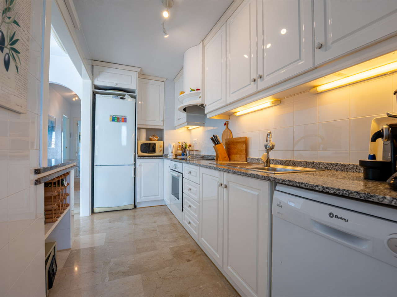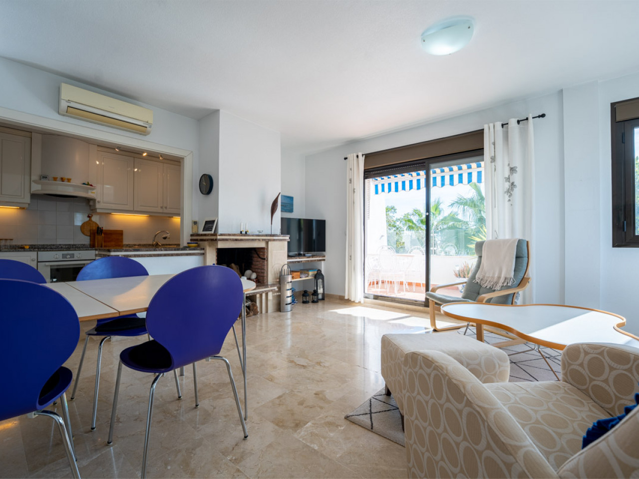 Het appartement beschikt over drie ruime slaapkamers en twee badkamers, waarvan één en suite. De open keuken sluit naadloos aan op de lichte woon- en eetkamer, waardoor een warme en uitnodigende ruimte ontstaat. Vanuit de woonkamer heeft u toegang tot een privéterras – de perfecte plek voor een ontbijt in de zon of ontspannen avonden in de buitenlucht.
