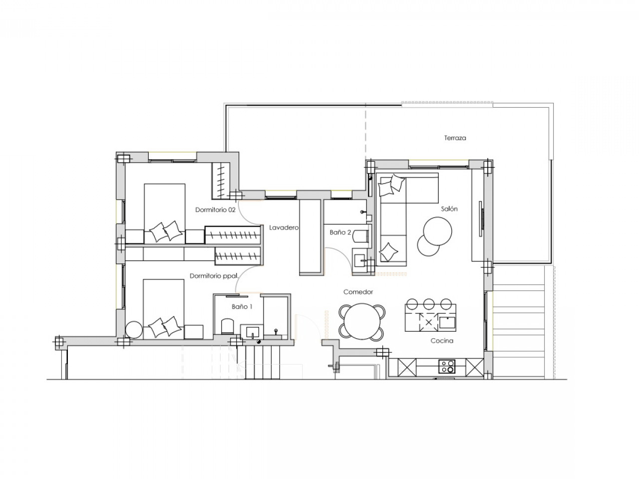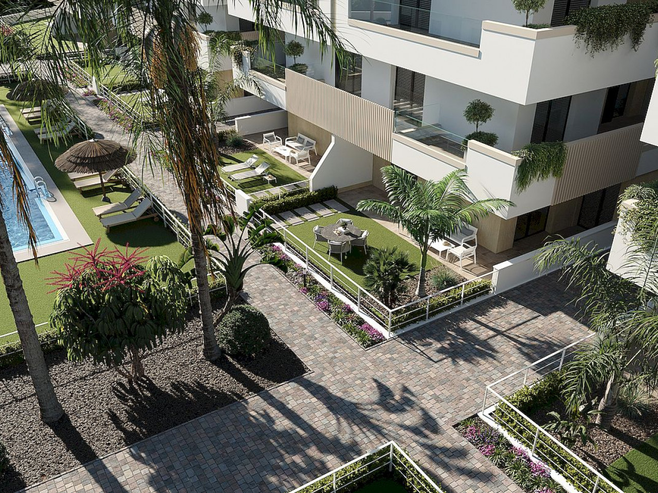 Er zijn vijf blokken met elk acht appartementen, met 2 gemeenschappelijke zwembaden, parkeerplaatsen en opslagruimtes. De appartementen zijn verdeeld over de begane grond met tuin, de eerste en tweede verdieping met terras en de derde verdieping met privékapsel, met twee woningen op elke verdieping en een lift om van de ene naar de andere verdieping te gaan.