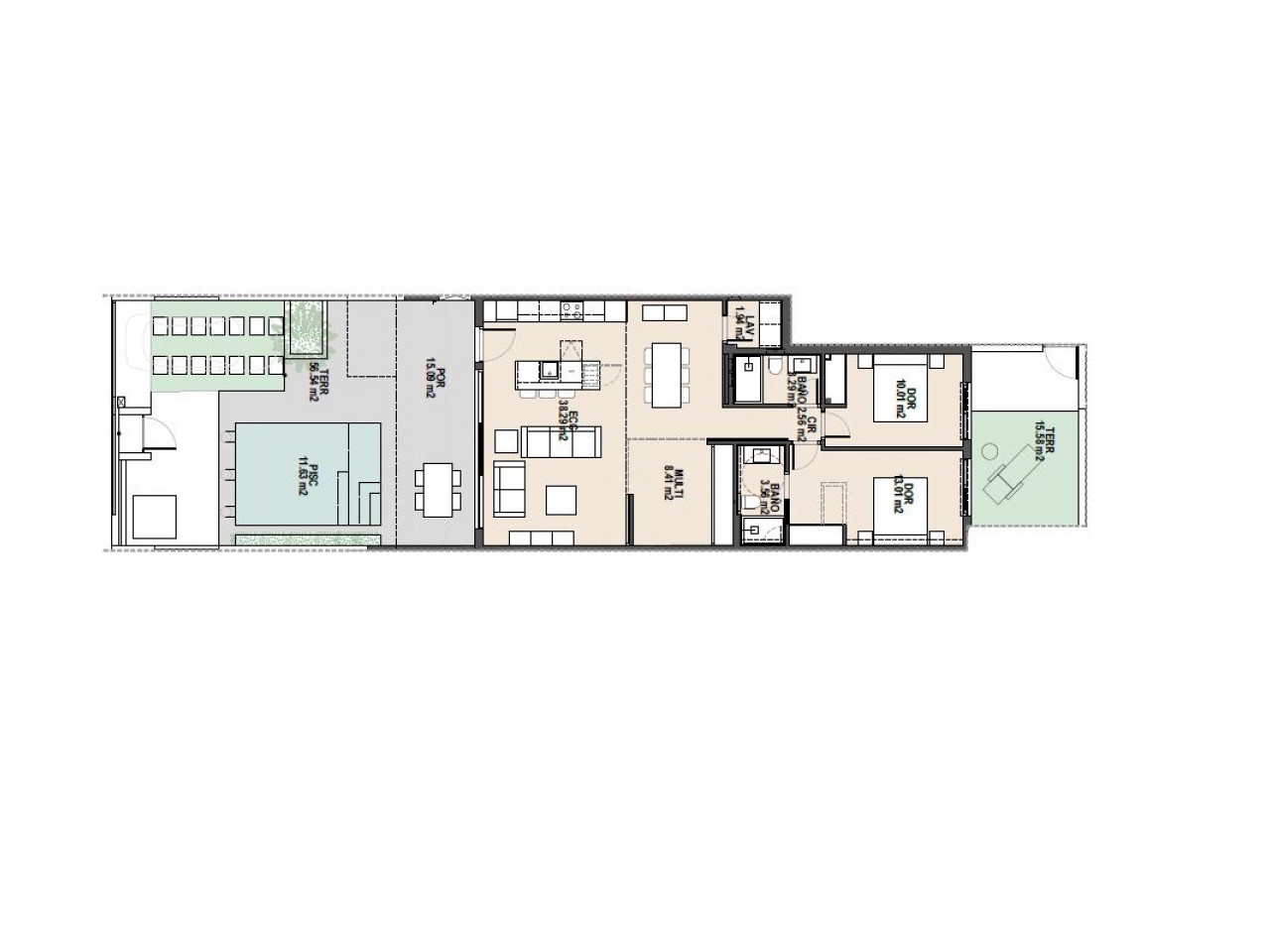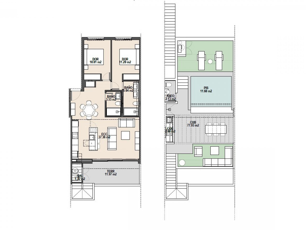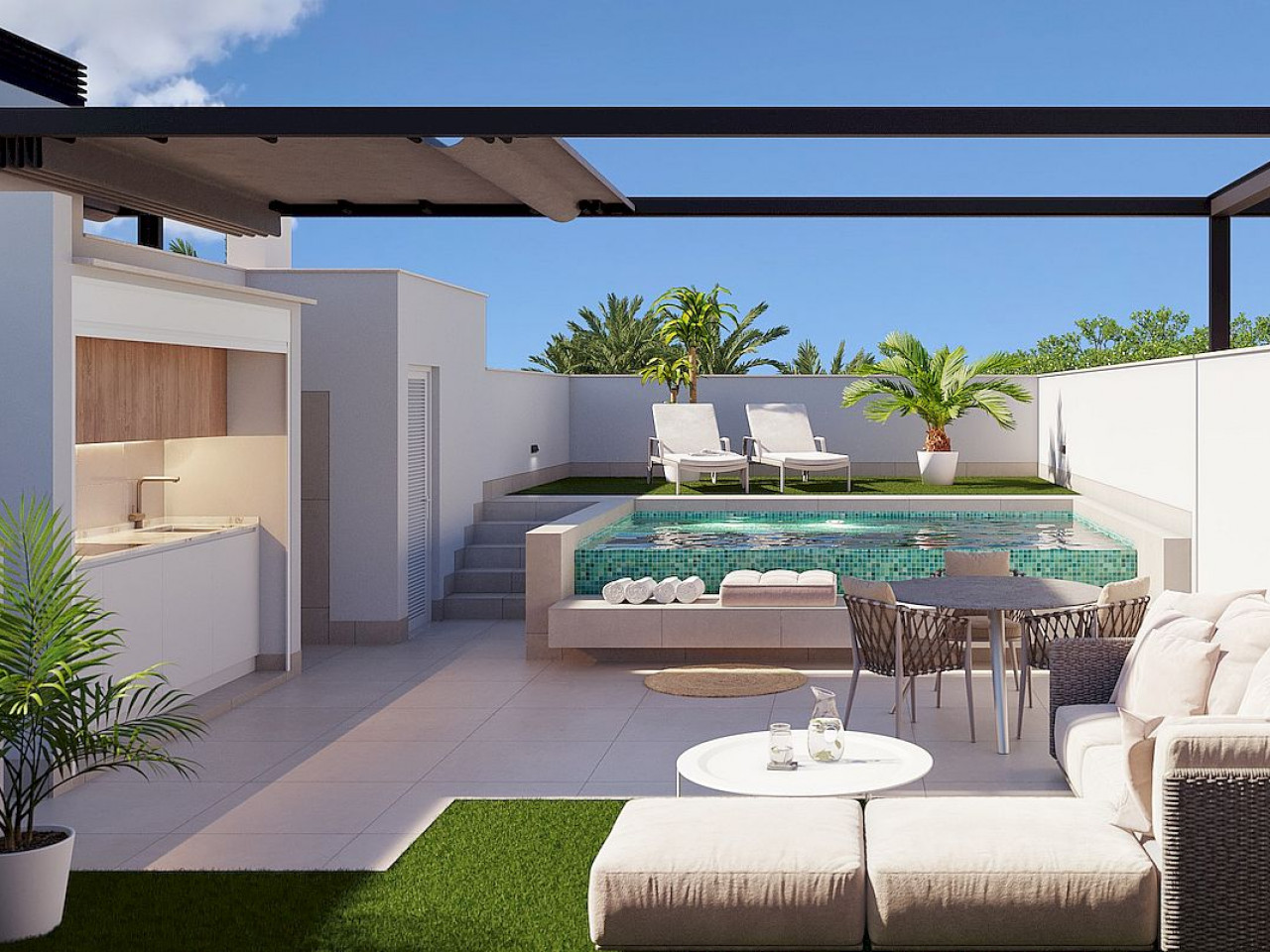Dit nieuwe project biedt een verscheidenheid aan indelingen met 2 en 3 slaapkamers, geschikt voor verschillende behoeften en levensstijlen. De maisonnettes op de begane grond hebben grote terrassen op het oosten/westen met privézwembaden met strandgedeelte en volledig aangelegde tuinen. Ze hebben twee of drie slaapkamers, twee badkamers, een wasruimte en een ruime indeling. De maisonnettes op de tweede verdieping zijn hetzelfde van binnen, maar hebben enorme solariums van waaruit u kunt genieten van het privézwembad, de volledig uitgeruste buitenkeuken, een pergola met doek en een afgesloten toilet op het dak, plus een speciale fietsenstalling op de begane grond.