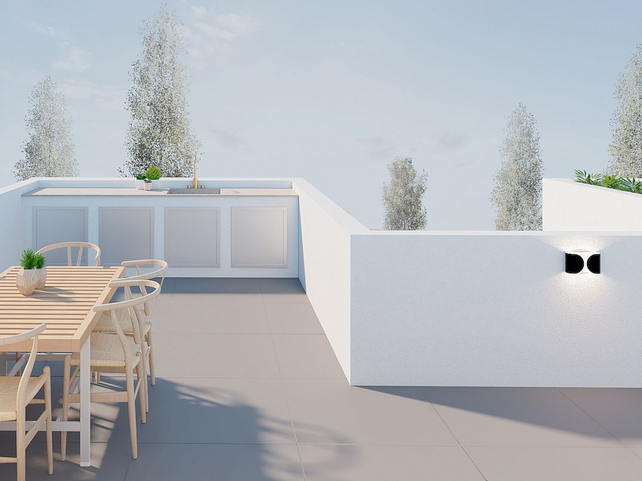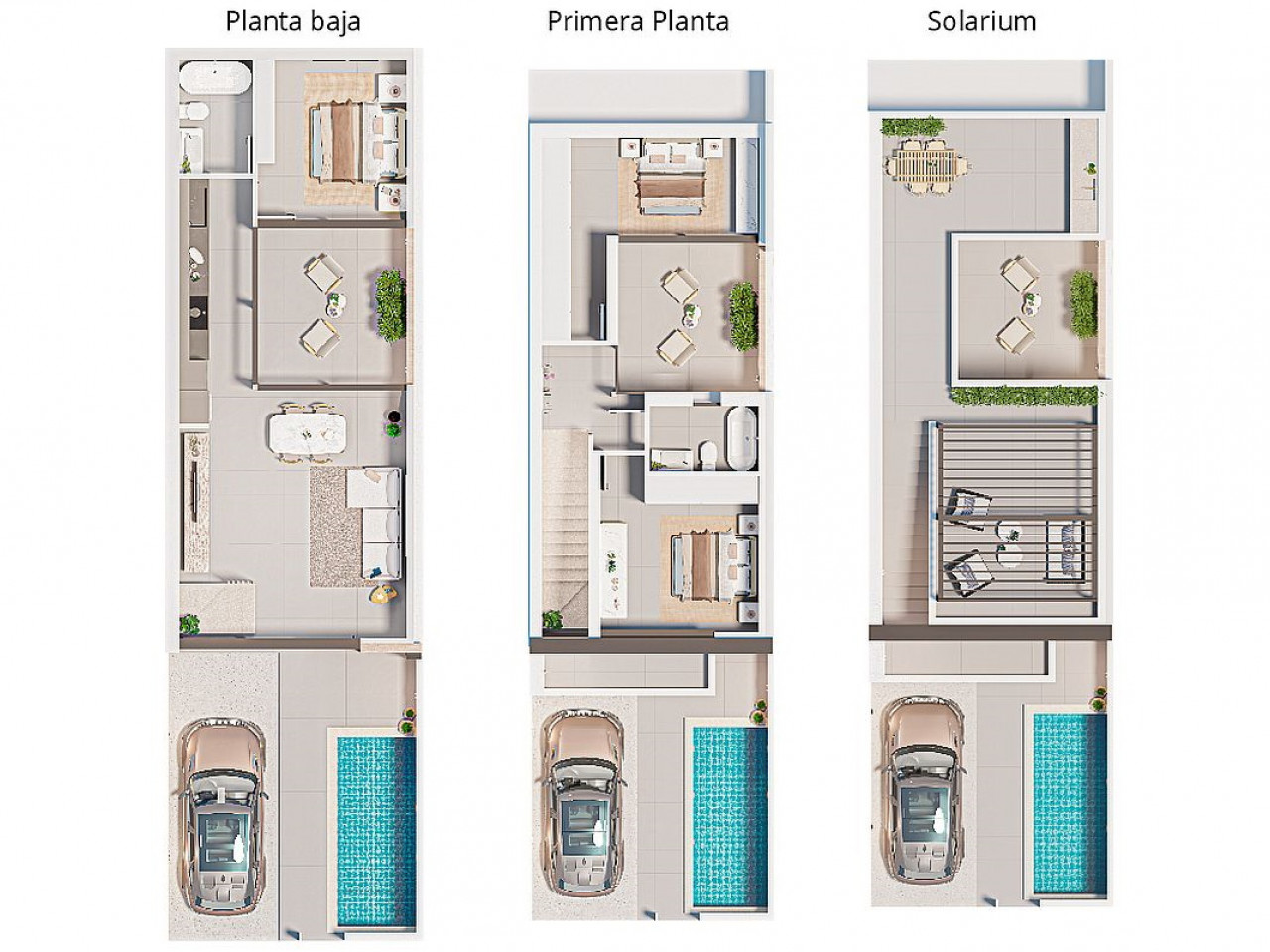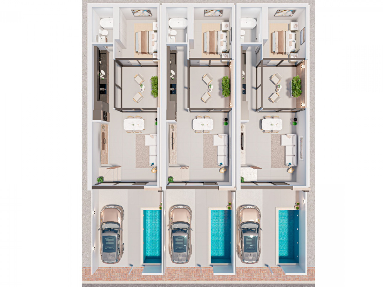 Dit exclusieve complex bestaat uit drie luxe herenhuizen die zijn ontworpen voor comfort en stijl. Elk huis heeft drie slaapkamers, twee badkamers, een privézwembad, een ruim terras, een binnenpatio, een solarium op het dak en een privéparkeerplaats. De woningen zijn uitgerust met badkamers, moderne keukens met inbouwapparatuur, vooraf geïnstalleerde airconditioning en hoogwaardige afwerking.