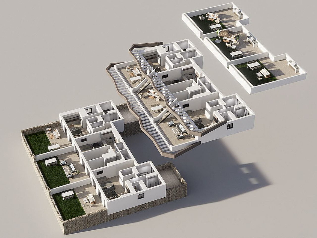 Deze moderne woningen hebben 2 of 3 slaapkamers, 2 badkamers en ruime woonkamers vol natuurlijk licht. Er is keuze tussen een maisonnette op de begane grond met een grote tuin (en de optie om een privézwembad toe te voegen) en een penthouse met ruim dakterras. Ze hebben allemaal een grote woonkamer met moderne open keuken en schuiframen die toegang geven tot het terras aan de voorkant.