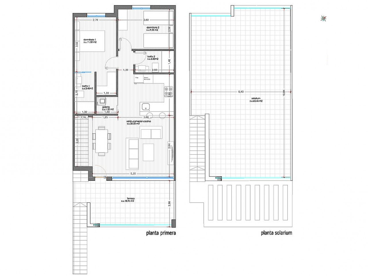 De maisonnette met 2 slaapkamers op de bovenste verdieping bestaat uit een zitkamer met openslaande deuren naar het terras, een open moderne keuken, bijkeuken/wasruimte, eethoek, een grote slaapkamer met ingebouwde kasten en en-suite, nog een tweepersoons slaapkamer en een gasten badkamer. De trap vanaf het terras leidt naar het privésolarium op het dak, waar u de hele dag van de zon kunt genieten.