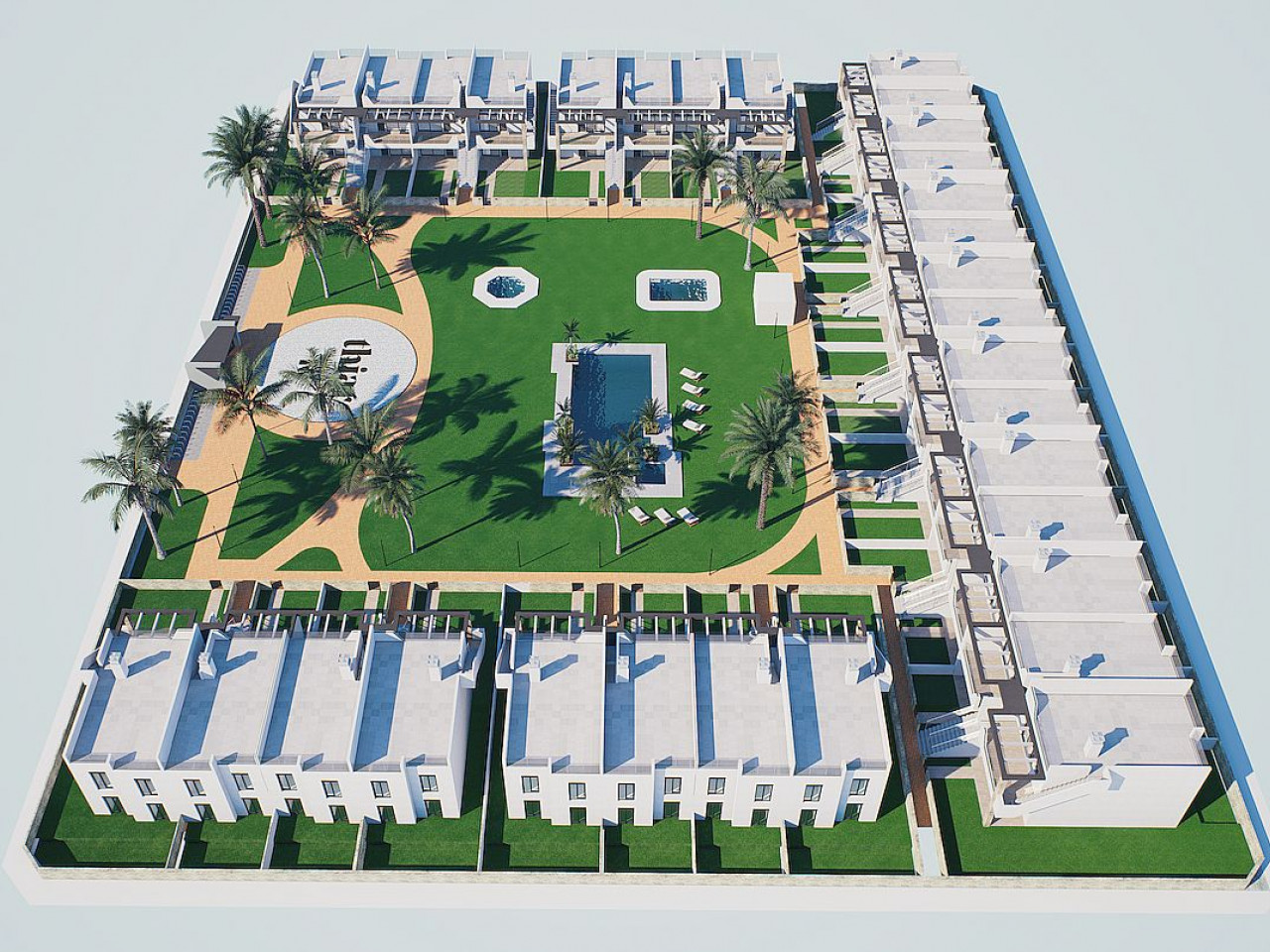 Met maar liefst drie slaapkamers en dat nabij het strand! Thiar Village Premium is een gloednieuw project bestaande uit luxe maisonnettes met twee en drie slaapkamers en twee badkamers, gelegen in het populaire Pilar de la Horadada, op korte loopafstand van talloze voorzieningen en de stranden met de blauwe vlag. De woningen op de begane grond hebben drie slaapkamers met grote tuinen en de maisonnettes op de bovenste verdieping hebben twee of drie slaapkamers, zonnige balkons en grote dakterrassen met uitzicht op zee. Alle maisonnettes op de begane grond met drie slaapkamers hebben een open plan tussen woonkamer en keuken, bijkeuken/washok, drie ruime slaapkamers met ingebouwde kasten, twee badkamers en een bijkeuken. De maisonnette op de bovenste verdieping bestaat uit een woonkamer met openslaande deuren naar het terras, een open moderne keuken, bijkeuken/wasruimte, eethoek, een grote slaapkamer met inbouwkasten en en-suite, nog een of twee slaapkamers en een gastenbadkamer. De trap vanaf het terras leidt naar het privédakterras waar je de hele dag van de zon kunt genieten. Dit omheinde exclusieve complex, met 3.450 m² aan gemeenschappelijke ruimten, heeft prachtig aangelegde tuinen, compleet met een verwarmd zwembad, een fitnessruimte, een lift naar de garage en een ondergrondse parkeerplaats. Het resort ligt in het centrum van Pilar de la Horadada en op slechts 5 minuten rijden van het strand van Higuericas. In Pilar de la Horadada vind je alle faciliteiten: boetiekjes, banketbakkerijen, goede restaurants met zowel lokale Spaanse, als andere soorten gerechten van een zeer hoge standaard. Het stadje Pilar ligt op een bijzondere plek in de provincie Alicante, vlakbij de mooie stranden van Torre de la Horadada. Hier vind je een goed ontwikkeld fietsnetwerk en kun je kiezen uit een breed scala aan sportactiviteiten. Zo ligt de golfbaan Lo Romero op slechts 10 minuten rijden. De luchthaven van Corvera (Murcia) ligt op 40 minuten en die van Alicante op 55 minuten rijden.