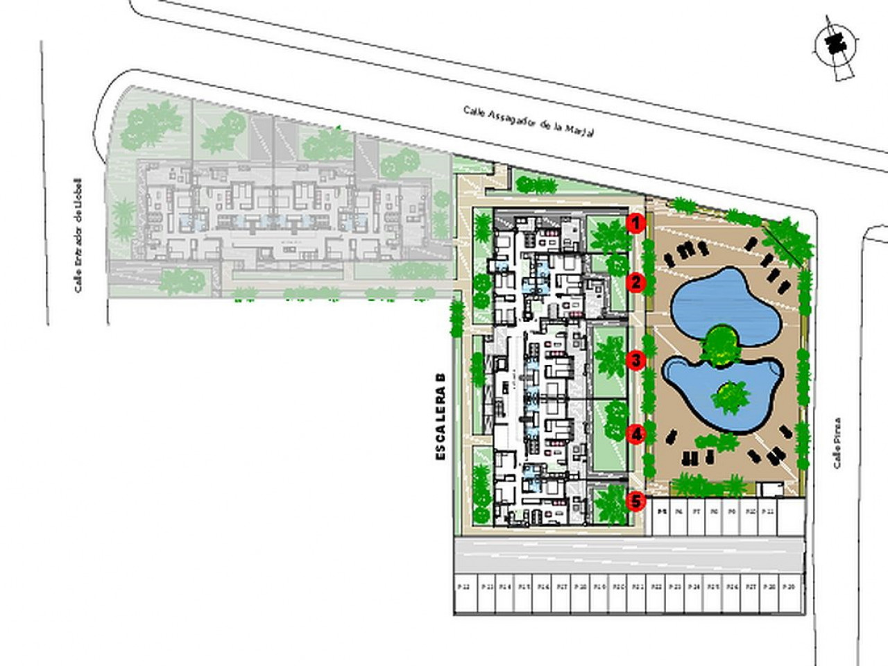 Het complex beschikt over een groot gemeenschappelijk zwembad voor alleen bewoners, een apart kinderzwembad, aangelegde tuinen en een buitenparkeerplaats voor fietsen.