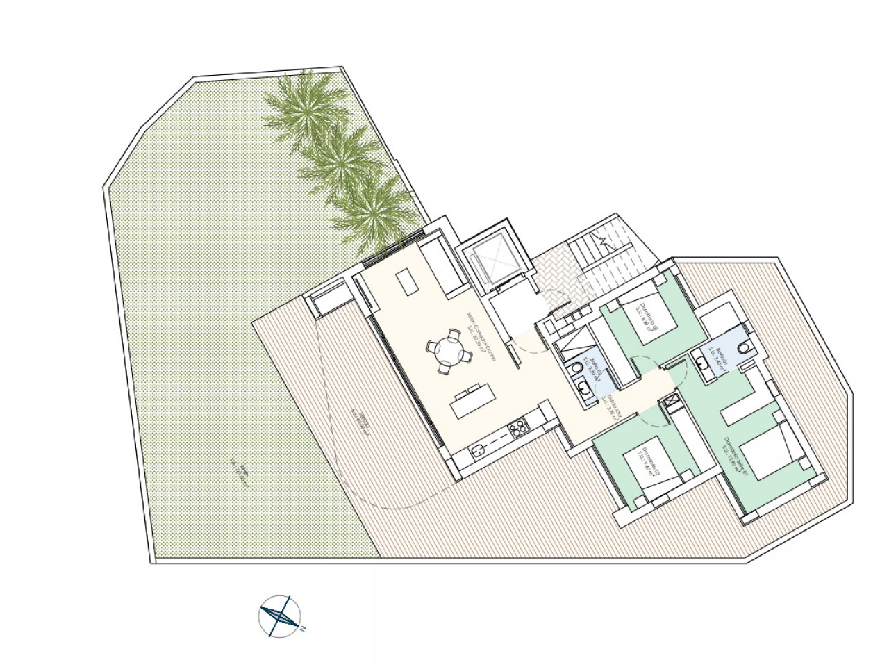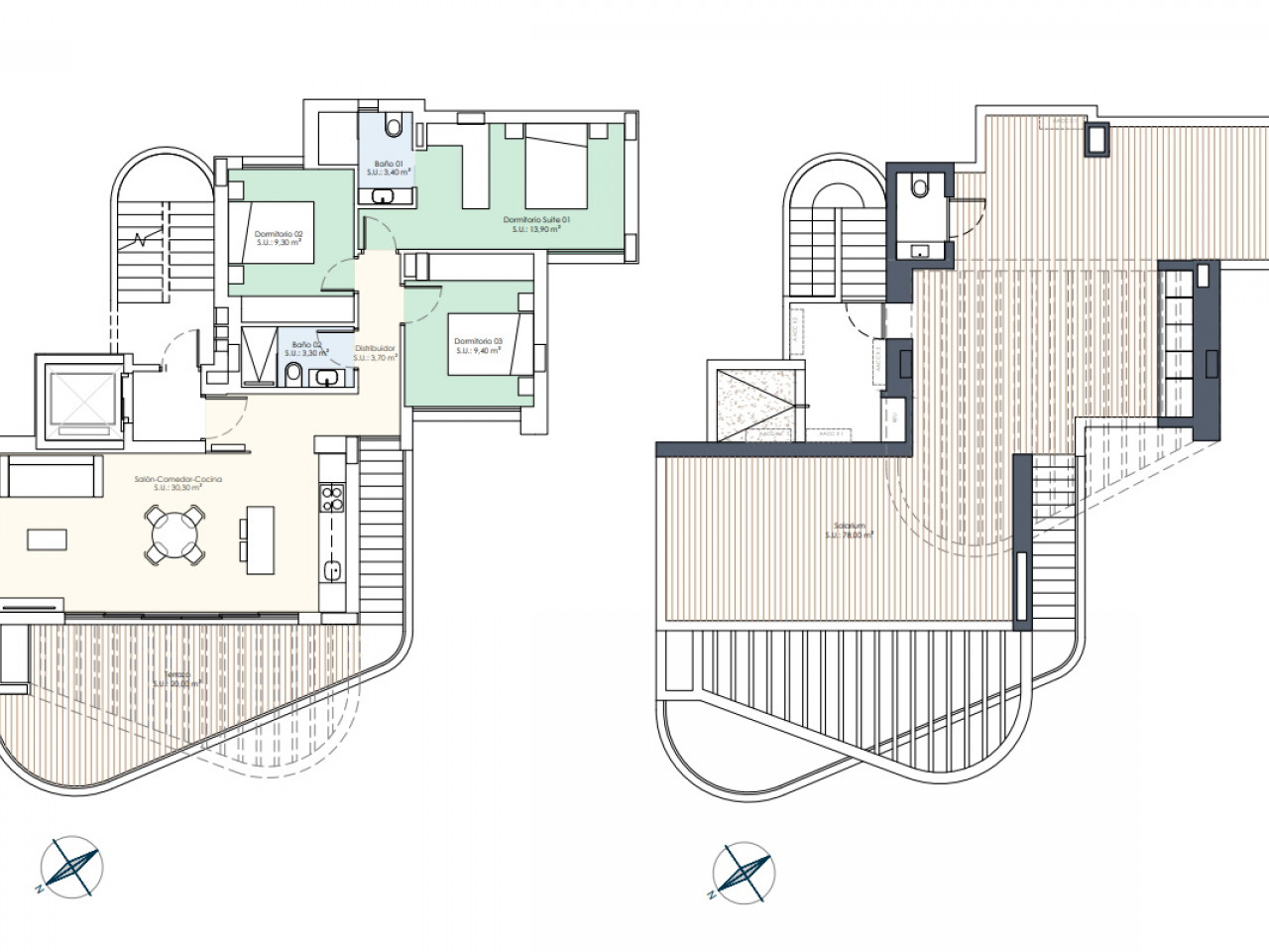 Het gebouw bestaat uit slechts 9 exclusieve woningen, één per verdieping, waardoor privacy, rust en comfort gegarandeerd zijn. Elk appartement heeft 3 slaapkamers en 2 badkamers, evenals ruime buitenruimtes, appartement op de begane grond met 120 m² privétuin, middelste verdiepingen met ruime terrassen en penthouse met terras en 78 m² privésolarium.