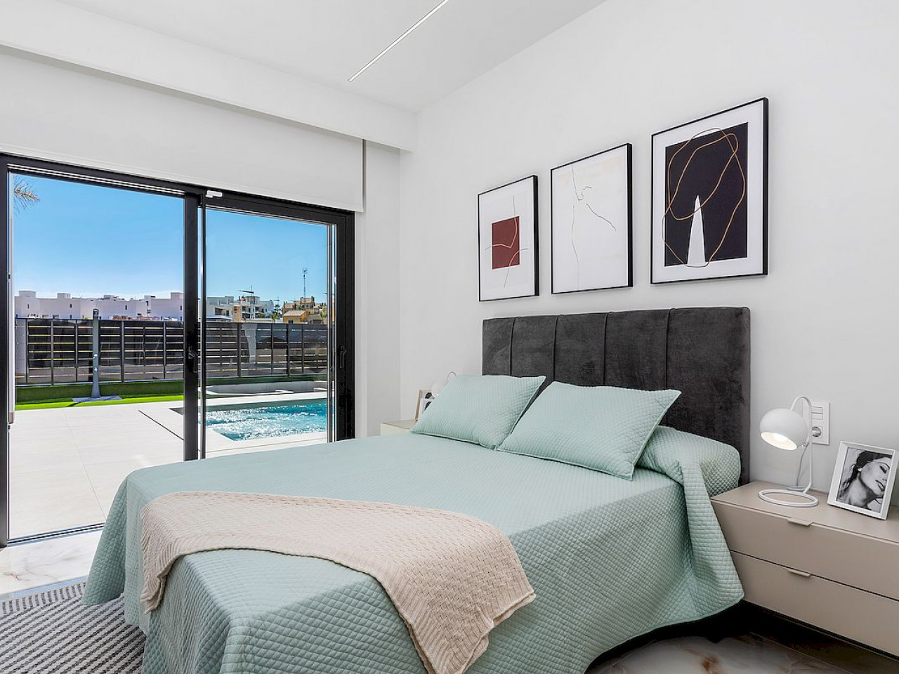 Deze villa is volledig gelijkvloers en bestaat uit een woon-/eetkamer met openslaande deuren naar de tuin en het terras met een privézwembad, en een open moderne keuken. Er is een hoofdslaapkamer met kleedkamer, en suite badkamer met toegang tot het terras, twee verdere tweepersoonsslaapkamers met inbouwkasten en toegang tot het terras en een gastenbadkamer. Een trap leidt naar een groot privé-dakterras met buitenkeuken en pergola, dat uitzicht biedt op het open landschap en de hele dag zon heeft.