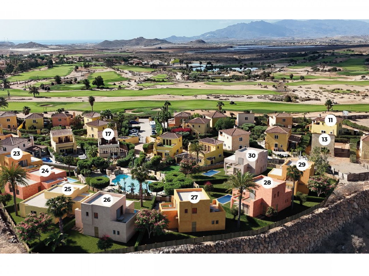 Deze villa’s zijn gebouwd met grote terrassen en pergola’s in hun eigen privétuinen, maar liggen in clusters die prachtige, individueel aangelegde tuinen en zwembaden delen in semi-besloten gemeenschappen. Ze bieden een prachtig uitzicht over de kampioenschapsgolfbaan Indiana en de bergketens daarachter en liggen op korte afstand van alle resortfaciliteiten.
