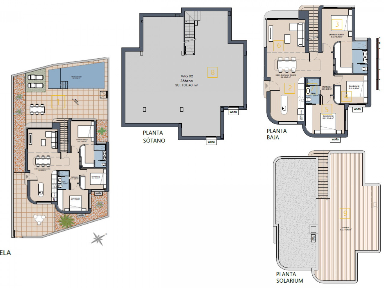 Deze gelijkvloerse vrijstaande villa’s aan de frontlinie van de golfbaan bestaan uit drie tweepersoonsslaapkamers (allemaal met inbouwkasten), een kleedkamer bij de hoofdslaapkamer, twee badkamers (en-suite bij de hoofdslaapkamer), een volledig ingerichte geïntegreerde keuken met ontbijtbar en een open woon-/eetkamer die uitkomt op het grote terras, de privétuin en het privézwembad. Het solarium op het dak biedt een fantastisch uitzicht over de golfbaan. Alle villa’s hebben een kelder en een parkeerplaats.