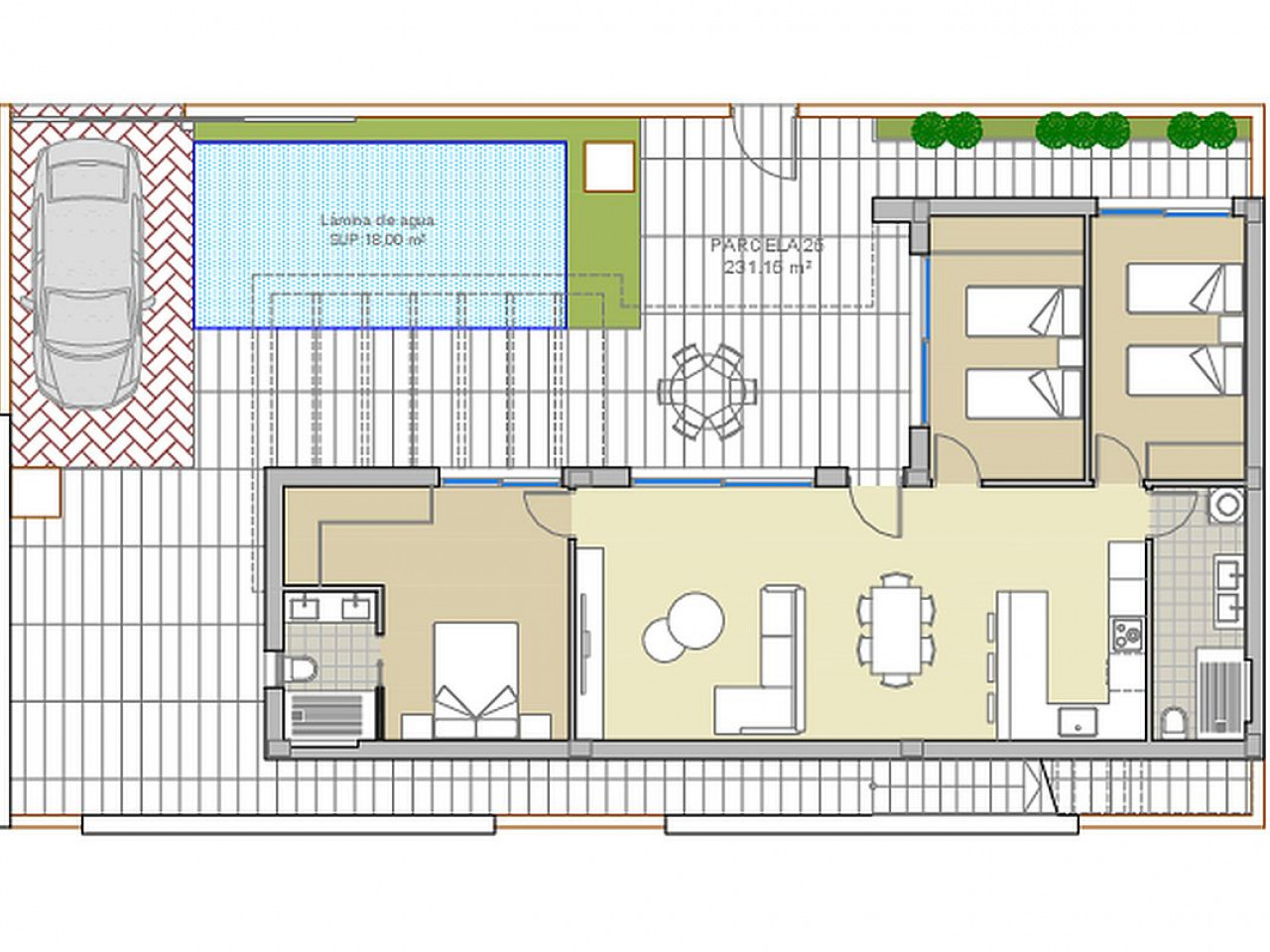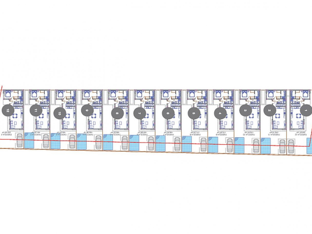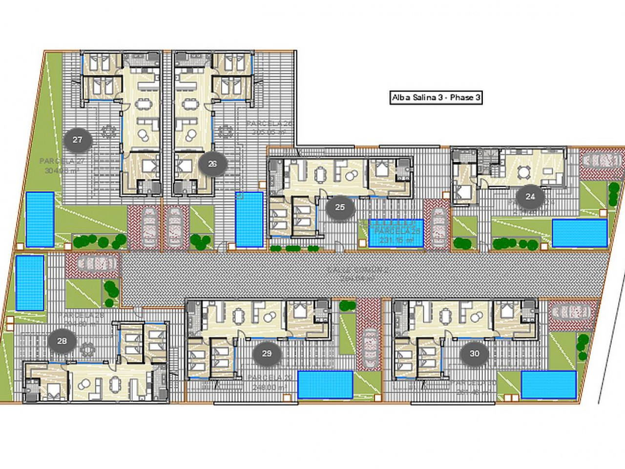 Deze twee verdiepingen tellende woningen bestaan uit drie tweepersoonsslaapkamers (allemaal met inbouwkasten en twee met directe toegang tot een terras op de eerste verdieping), een kleedkamer in de hoofdslaapkamer, twee badkamers (waarvan een en-suite), een apart toilet, een volledig uitgeruste moderne keuken met ontbijtbar en een open woon/eetkamer, die leidt naar de privétuin met optioneel zwembad.