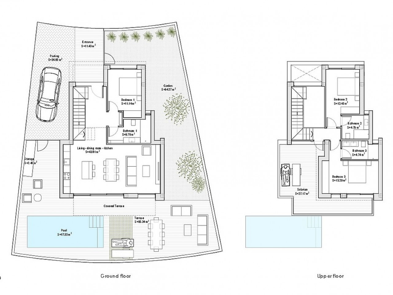 Elke woning heeft een eigen parkeerplaats op het terrein en een buitenberging, een privézwembad met douche en een groot terras. De huizen hebben een terras op de begane grond en een groot terras op de eerste verdieping, waar u elke dag van het jaar van de zon kunt genieten.