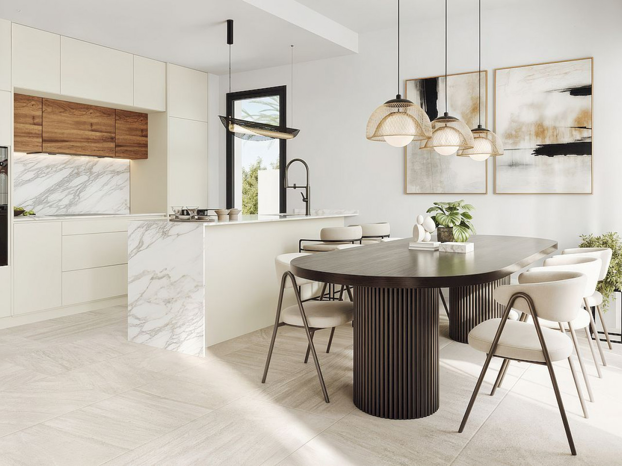 Binnen hebben de woningen een modern open ontwerp voor de belangrijkste leefruimte. Deze bestaat uit de woonkamer, eetkamer en een hoogwaardige moderne keuken, compleet met apparatuur. Deze hoofdruimte kan worden uitgebreid via de kamerhoge glazen deuren naar het terras, de tuin en het zwembad.