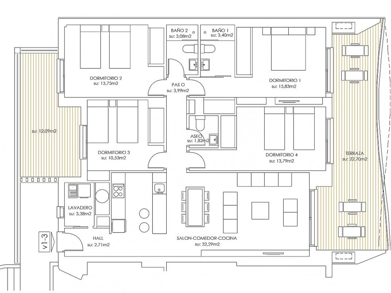 Het resort zal beschikken over prachtig ingerichte, moderne appartementen met grote terrassen, hier kunt u kiezen tussen twee slaapkamers of drie slaapkamers en twee badkamers. Alle penthouses hebben een groot privé solarium.