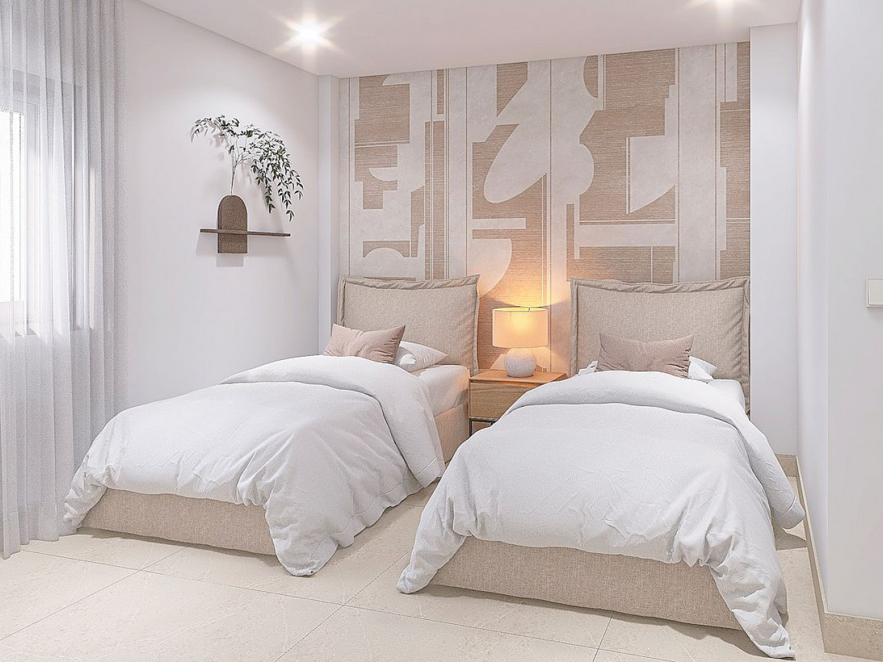 Op de begane grond is er een slaapkamer, badkamer, open keuken naar de woonkamer, wasruimte en toegang tot de tuin. Boven vinden we 3 slaapkamers, waaronder de hoofdslaapkamer met en-suite badkamer. Er is een privésolarium op de bovenste verdieping, ideaal om te genieten van het mediterrane klimaat en het open uitzicht. Alle woningen hebben een privégarage van meer dan 60 m² in de kelder, met directe toegang tot de woning. De chalets hebben een privétuin met de mogelijkheid van een zwembad, beschikbaar tegen een meerprijs.