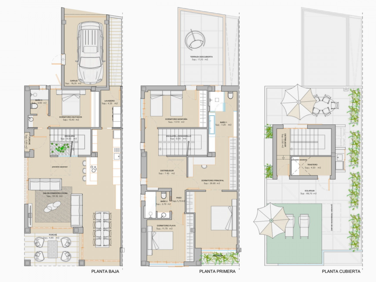 Elke villa beschikt over 4 slaapkamers en 3 badkamers op ruime percelen van meer dan 300 m. De begane grond omvat een eigen afgesloten garage, wasruimte, een ruime woonkamer met open keuken, directe toegang tot een overdekte veranda en een prachtig aangelegde voortuin met een infinity pool met uitzicht op zee. Er is ook een slaapkamer en een badkamer op deze verdieping, ideaal voor gasten of flexibel wonen.