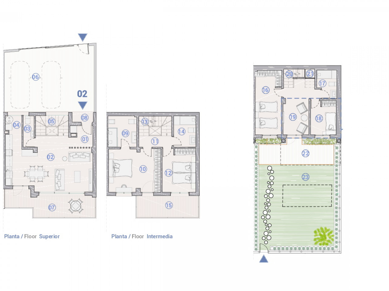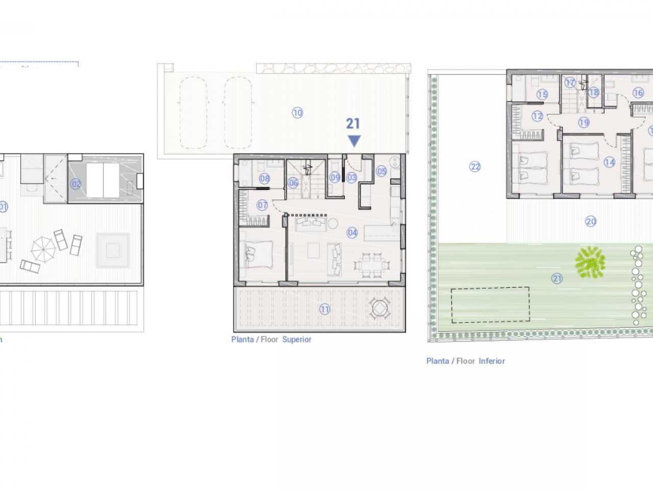 De woningen hebben verschillende terrassen met uitzicht, parkeergelegenheid voor twee auto’s en een tuin met directe toegang tot de gemeenschappelijke ruimtes. Het complex heeft verschillende gemeenschappelijke faciliteiten, waaronder een zwembad, groene ruimtes, sportfaciliteiten en recreatiegebieden. Deze zijn ontworpen om bewoners de mogelijkheid te bieden te ontspannen, te socialiseren en actief te zijn.