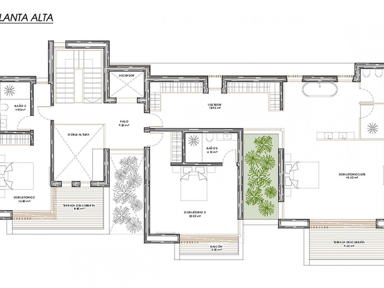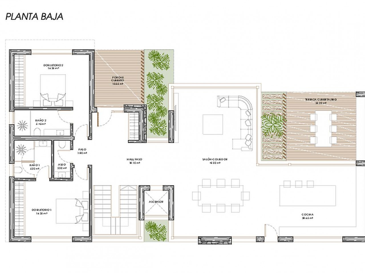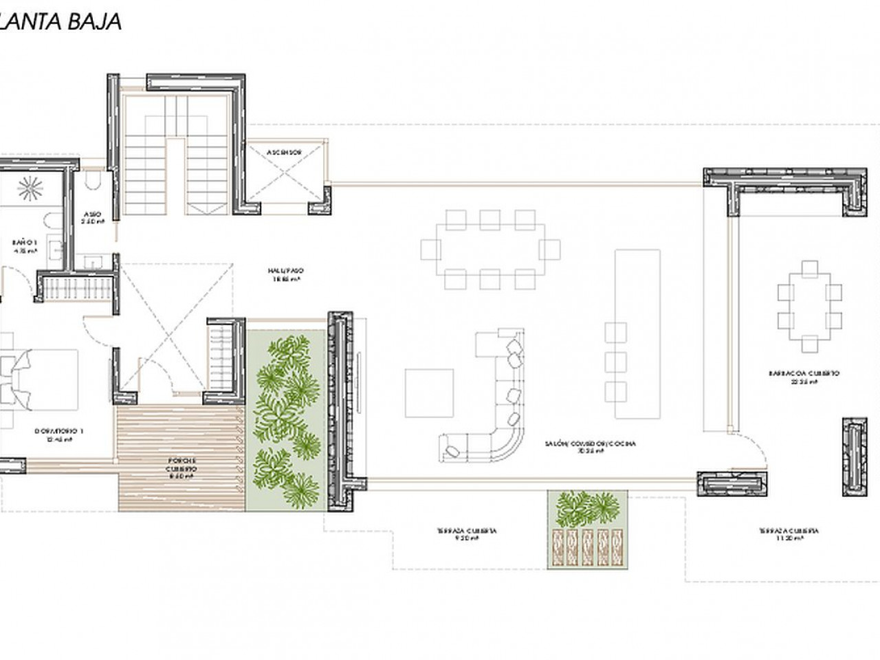 De hoofdruimte integreert de woonkamer, eetkamer en keuken in een ruime en lichte ruimte die ook overgaat in het buitenterras door de grote ramen, gecombineerd met de geïntegreerde tuin. De oriëntatie van de kamers en de aanwezigheid van grote ramen zorgen voor een permanente coëxistentie tussen het interieur en het exterieur van het huis, waardoor omgevingen kunnen samensmelten en deel uitmaken van een unieke visuele ruimte.