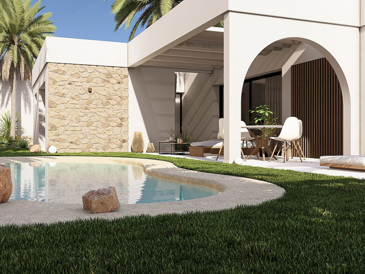 Elk van deze individuele woningen ligt op ruime kavels met een eigen tuin en zwembad die samen met hun strategische oriëntatie je uitnodigen om van het buitenleven te genieten en het warme zonlicht te omarmen.